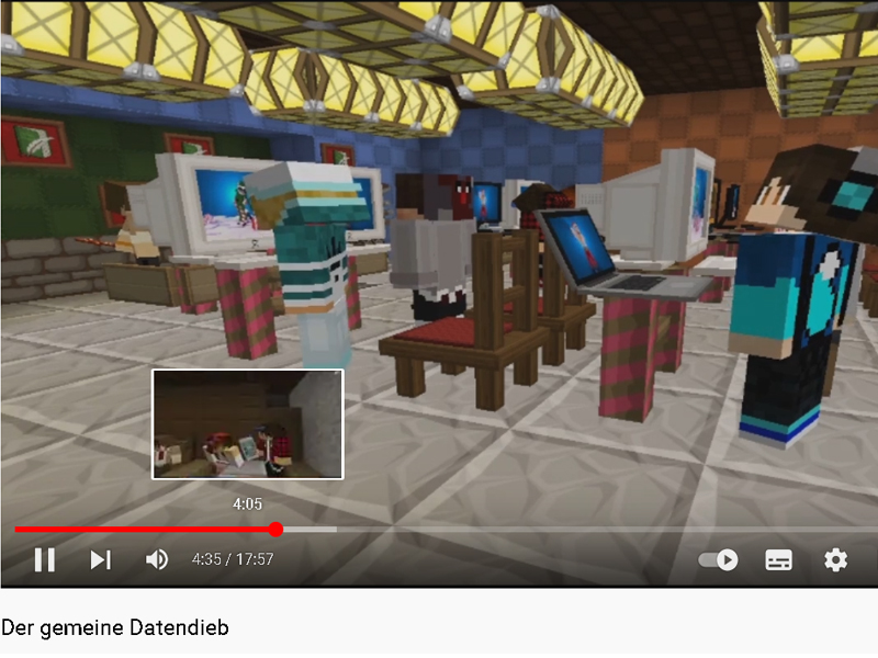 Hierbei wird das Potenzial von Minecraft genutzt um eigene Filme zu erstellen. Zusammen überlegt ihr euch eine Story und schreibt ein kleines Drehbuch. Danach werden in einer Minecraft Welt die Kulissen gebaut. Im Mehrspielermodus werden Spielabläufe mit euren eigenen Skins filmisch aufgenommen und anschließend in einem Videoschnittprogramm zusammengefügt und vertont. Gesprochener oder geschriebener Text kann die die Story unterstützen.